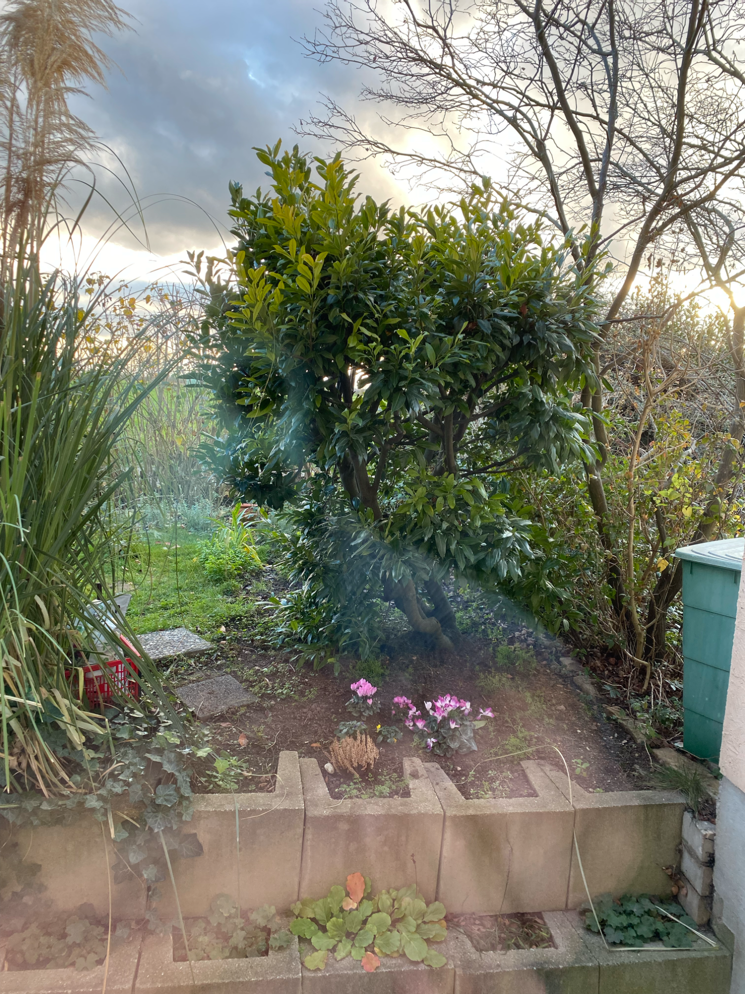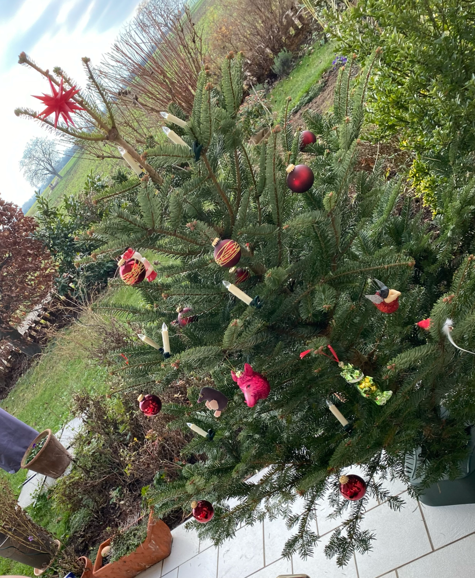 Von Dezember bis Spätsommer: Der erste Tannenbaum auf der Terrasse. Zauberhafte Stimmungen gab's, wenn der Nebel sich über alles legte. Manches gelang nicht. Ich hätte so gern Alpenveilchen im Winter. Aber sie zogen sich zurück. Der Herbst zeigte Farben (der Ahorn vorm Haus). Die geschenkte Hortensie "Traudelchen" kam in die Erde. Die Bohnenpflanzen "Elli" mit ihren Stecken machten sich gut in unserem Garten. Ich konnte Bohnen ernten!
